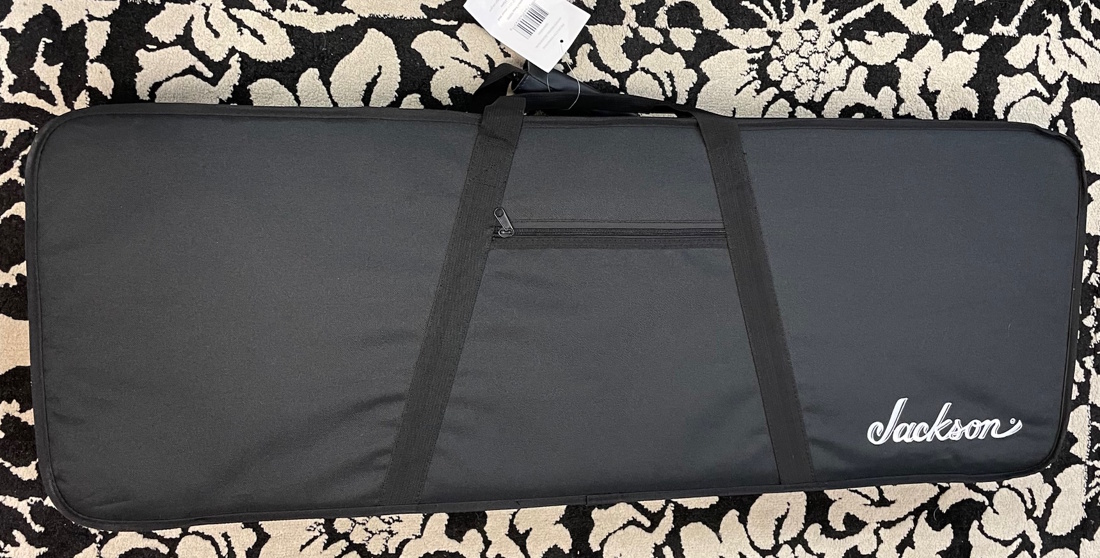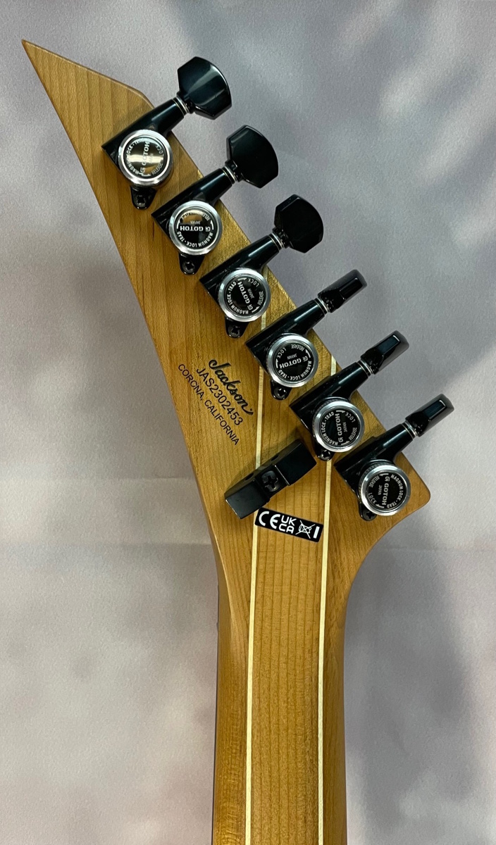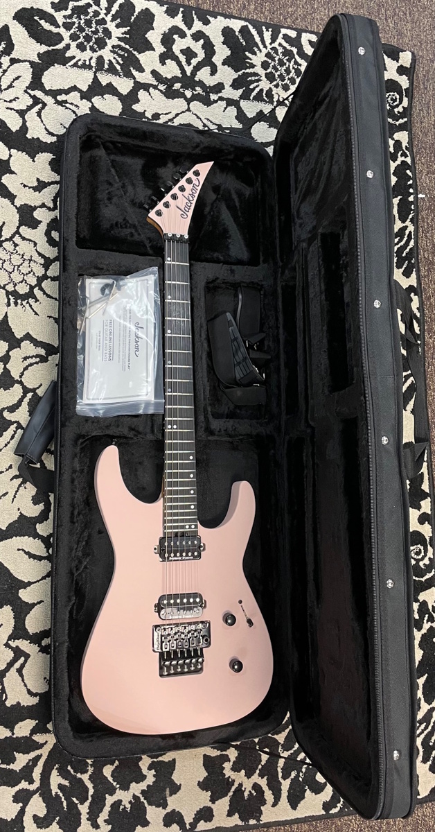 - Available in Mystic Blue, Satin Black, Satin Shell Pink and Specific Ocean with a color matched, bound Jackson pointed 6-in-line headstock and black hardware